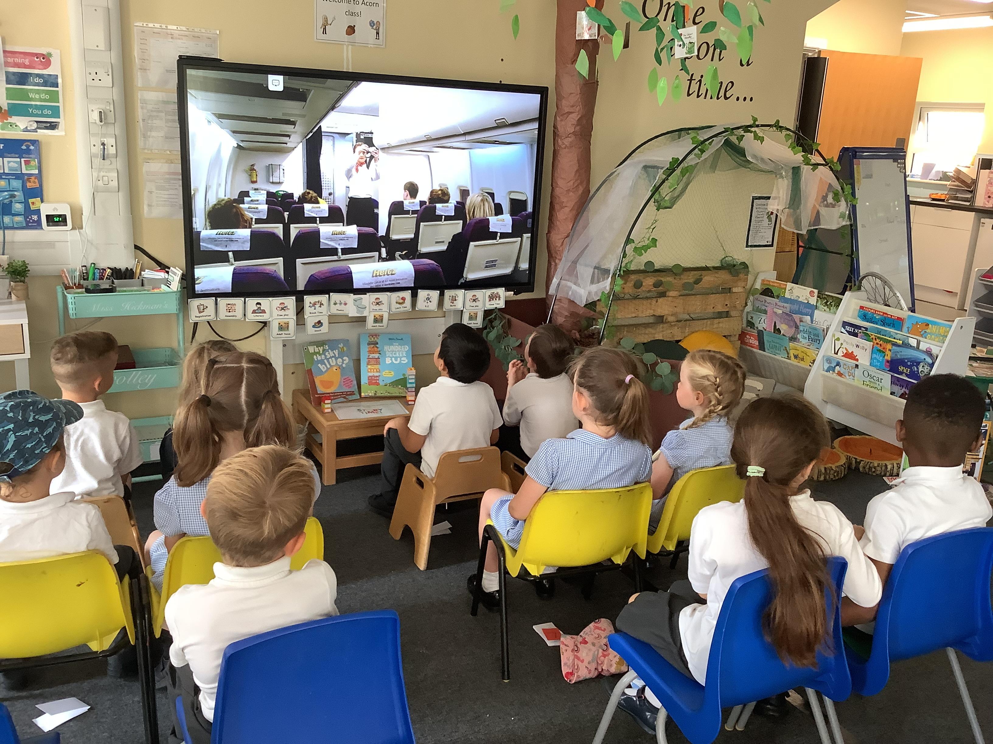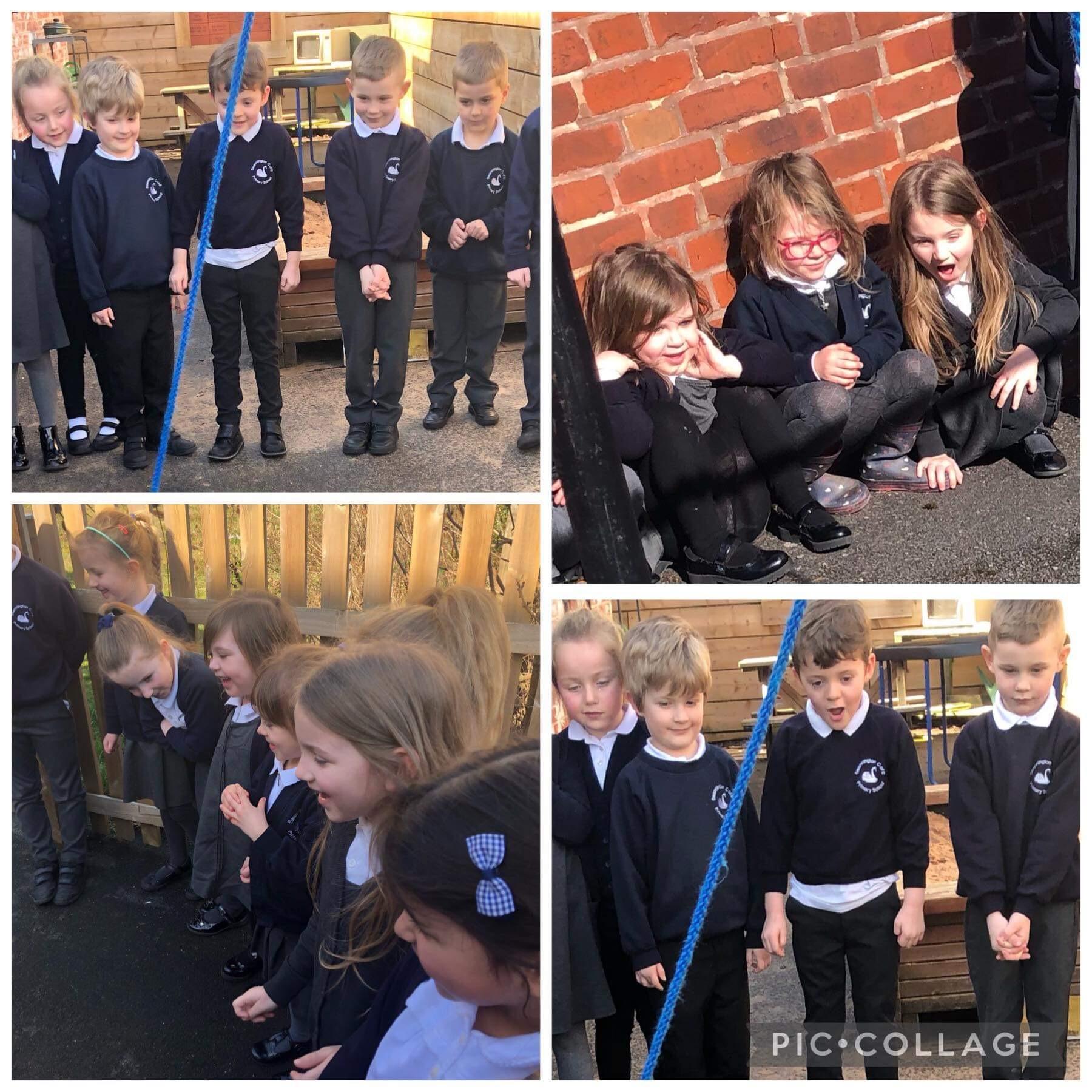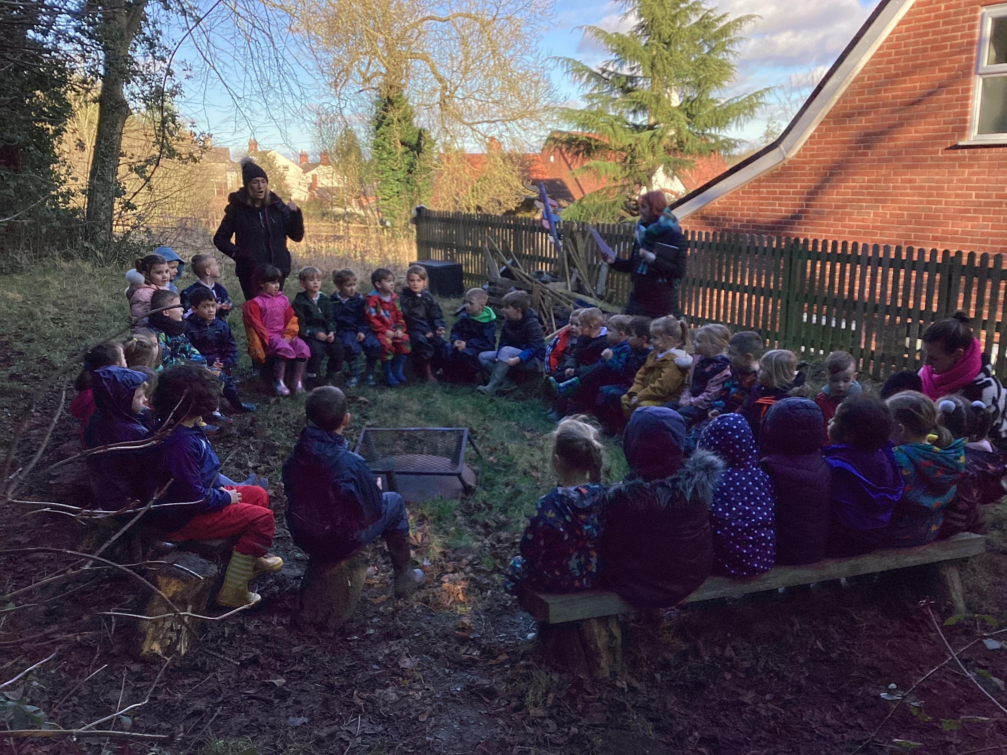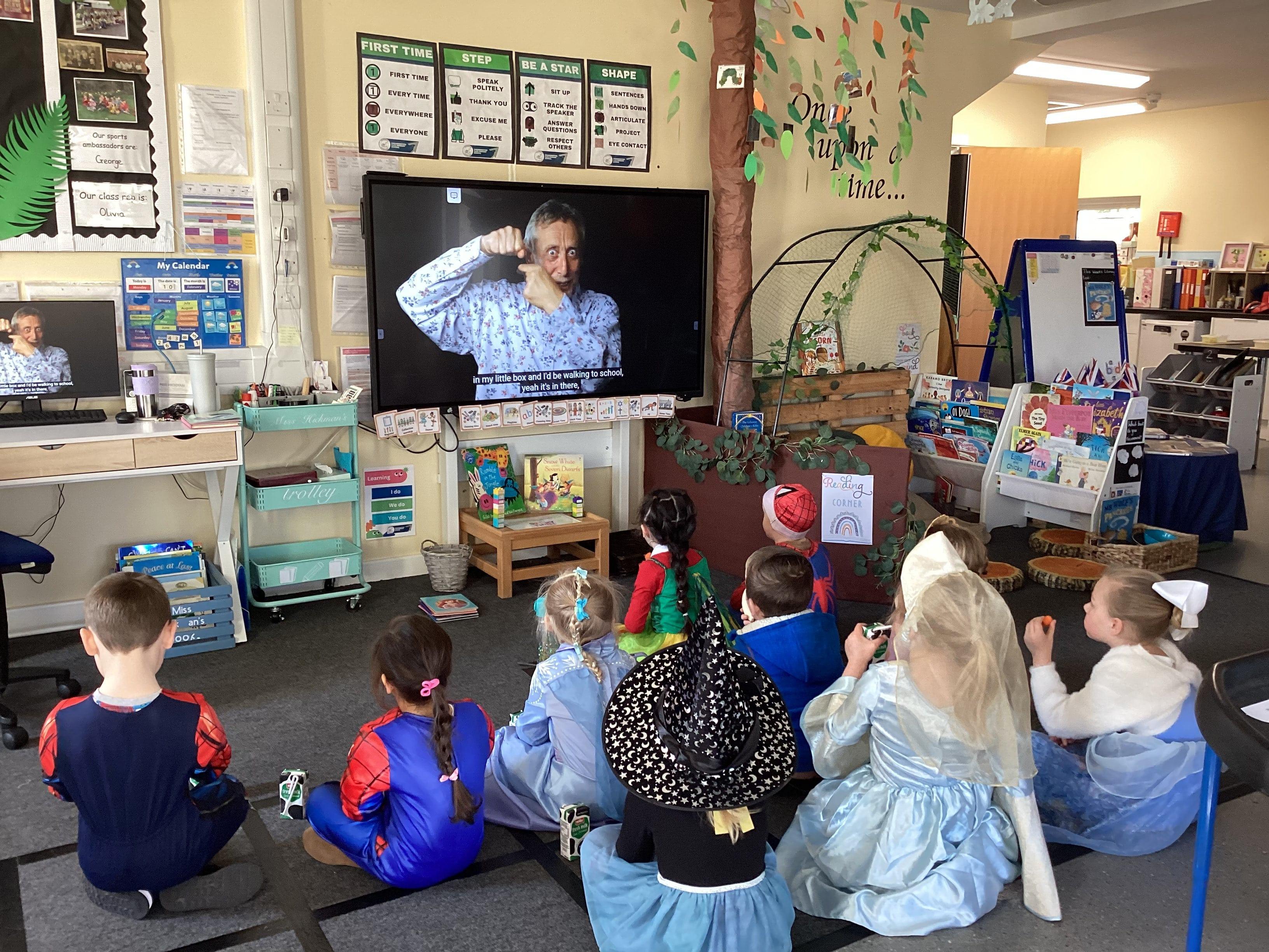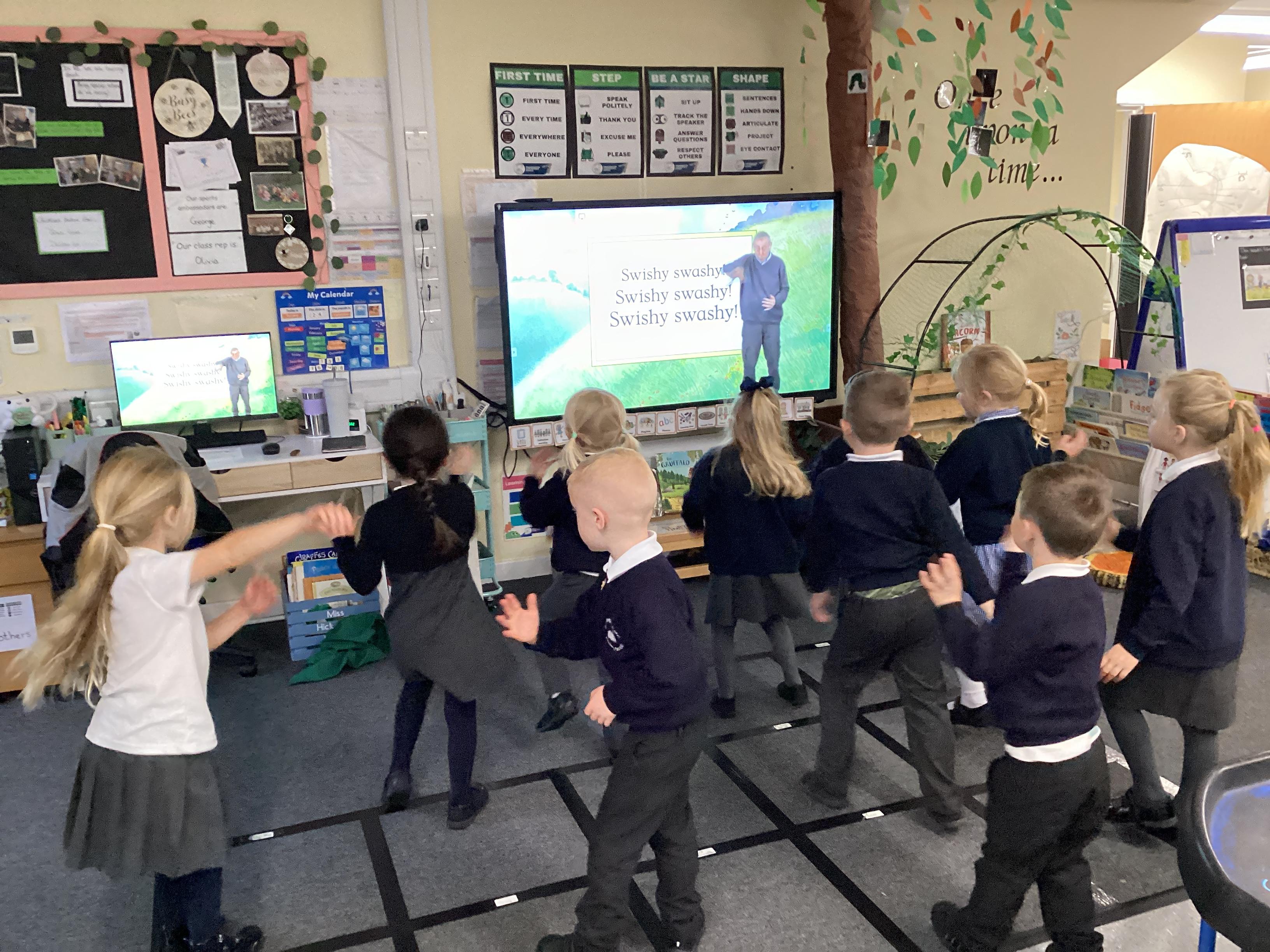 An exciting visit from another EYFS class- February 2024
