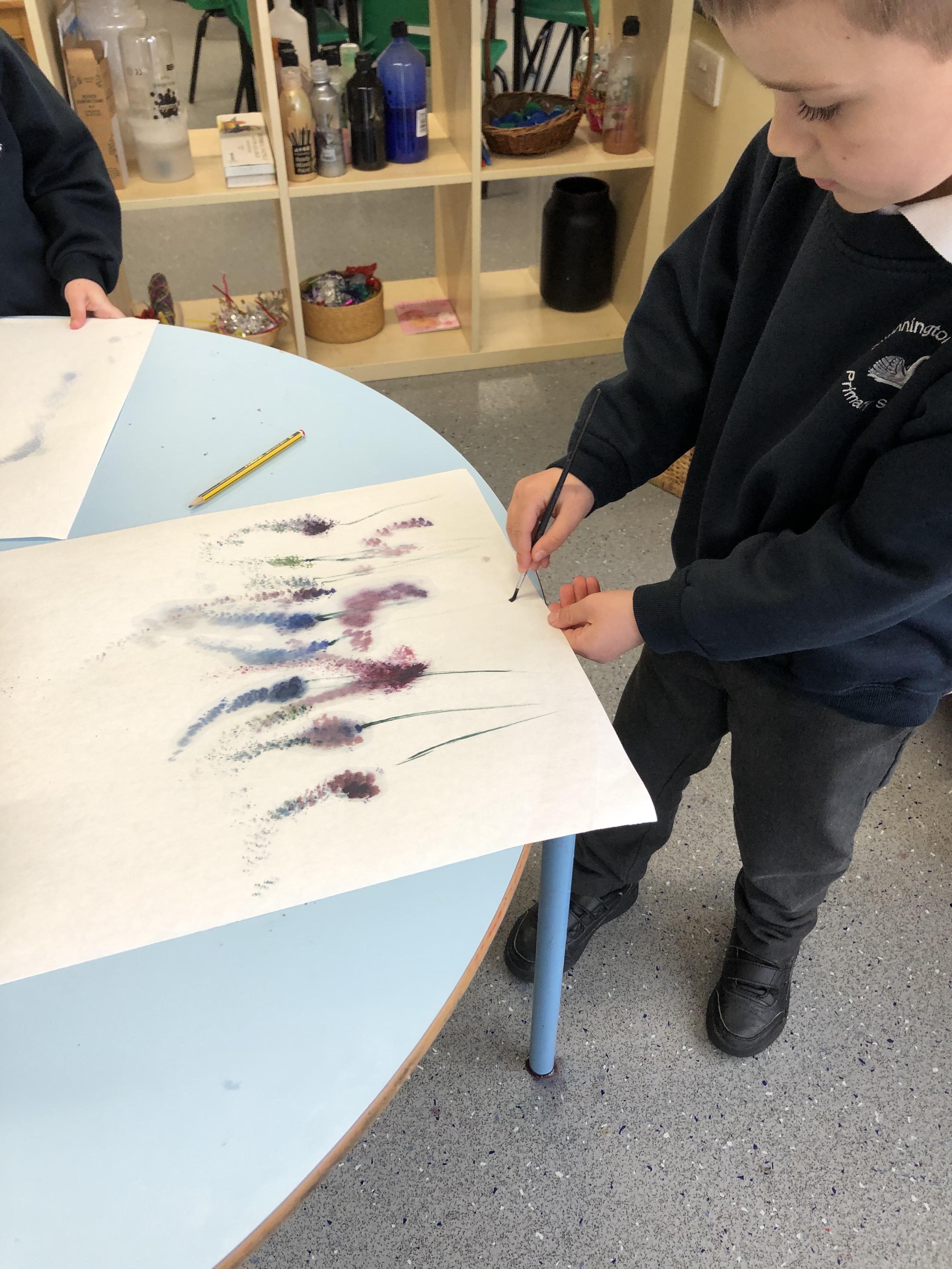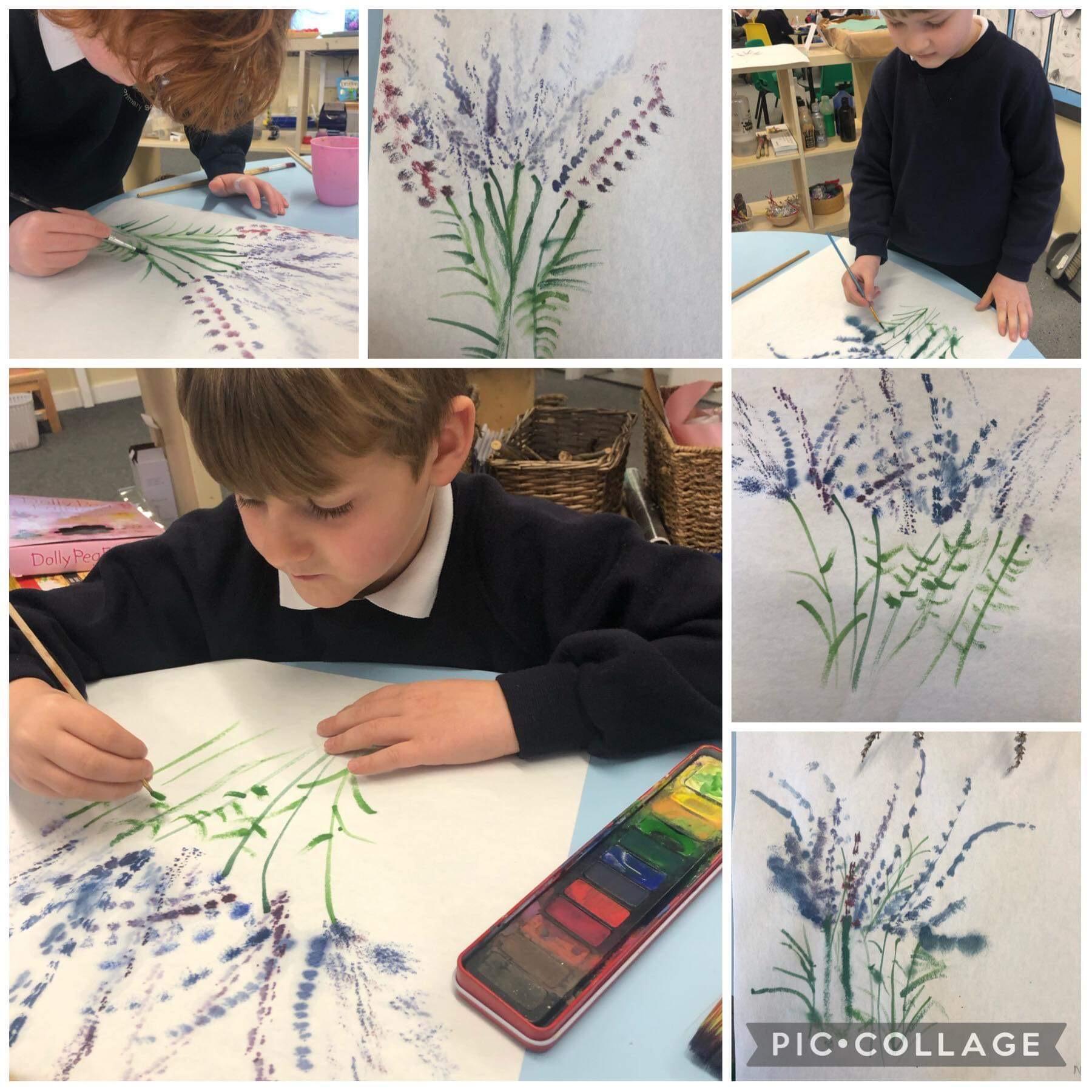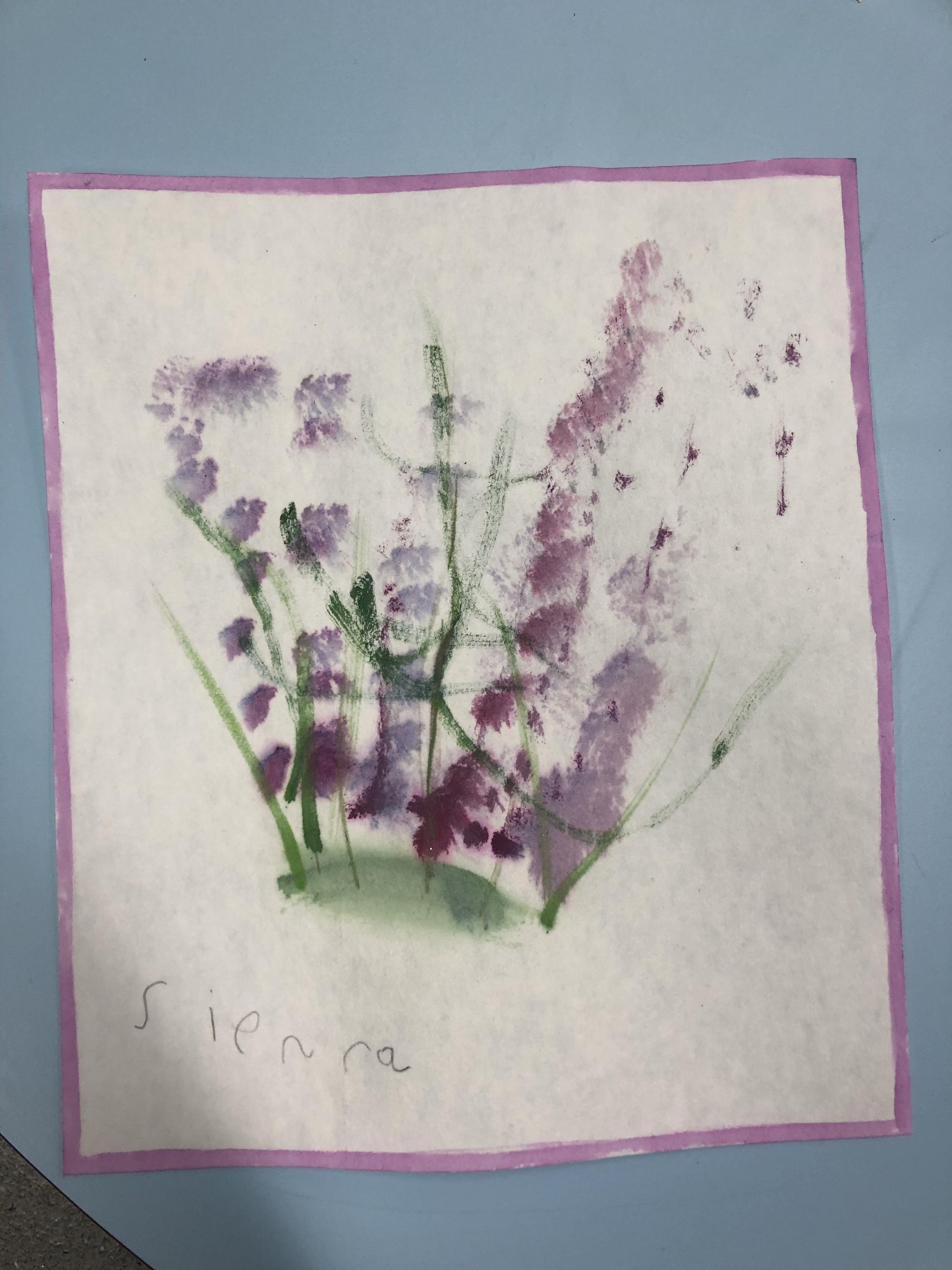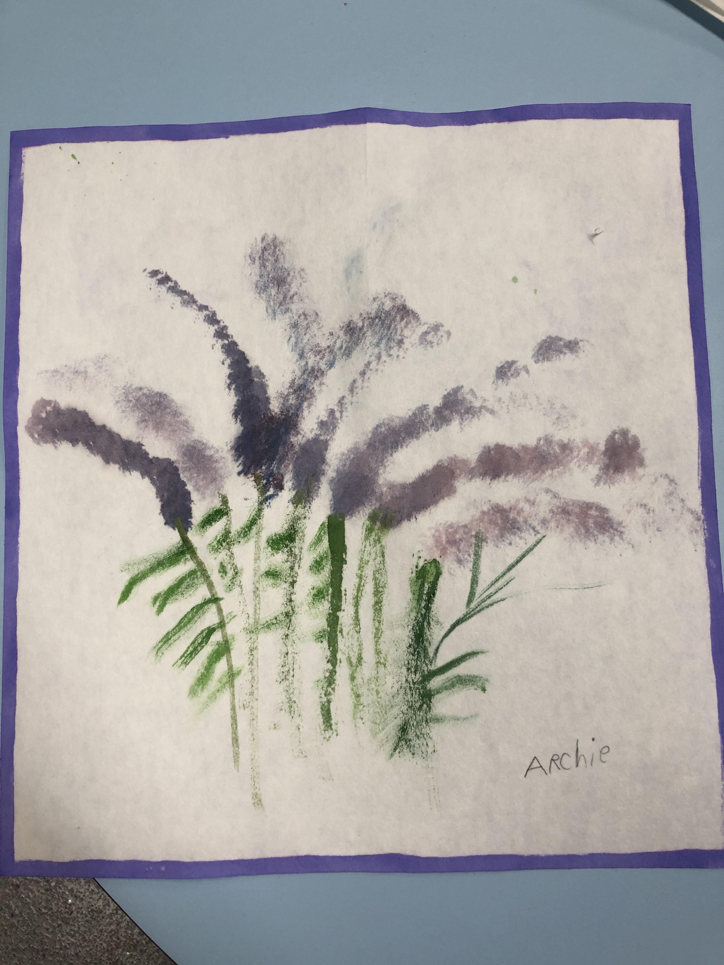 Impressions of Lavender using water colour. We explored techniques inspired by the late artist Bob Ross (The Joy of Painting) to create impressions of lavender. The children's paintings are beautiful.