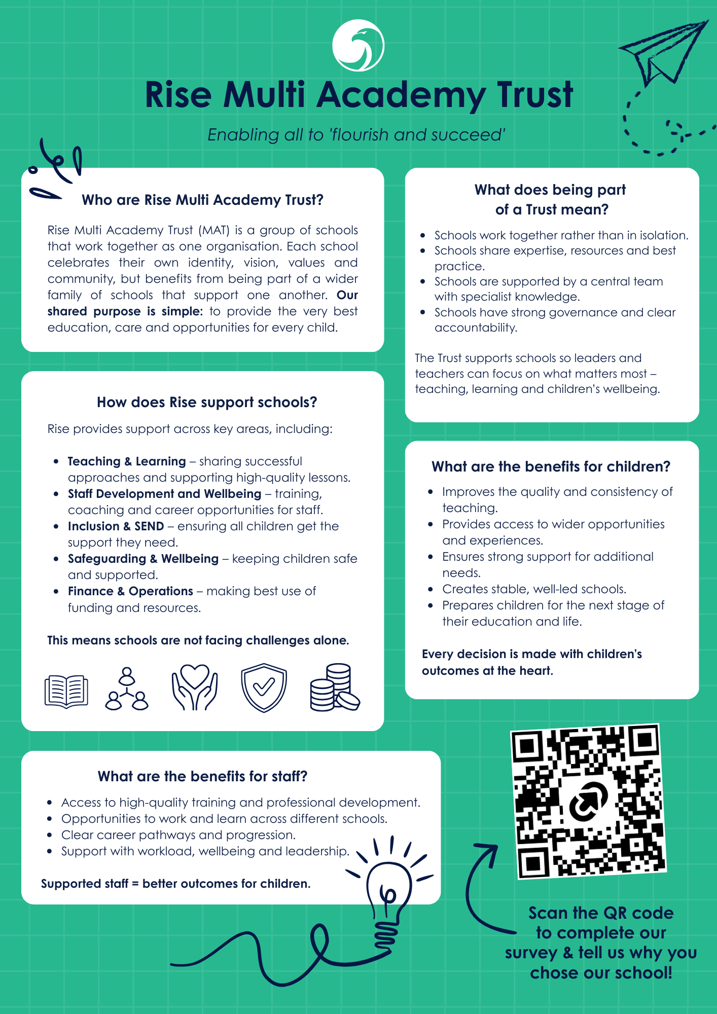 For further information about the Rise Multi Academy Trust, including Trust policies, financial information, and contact details, please visit the Rise website: Rise Multi Academy Trust.