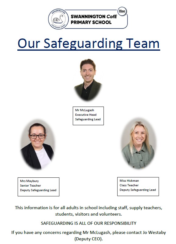 All the children know they can talk to any 'trusted adult' in school and also know that Mr McLugash, Mrs Maybury and Miss Hickman are the 'Safeguarding Team'. If you have any worries or concerns about a child then please contact us to talk.